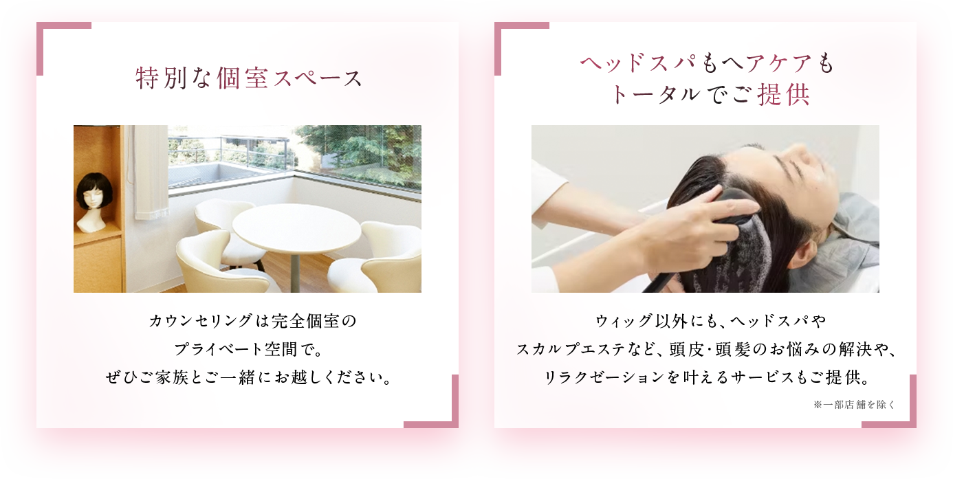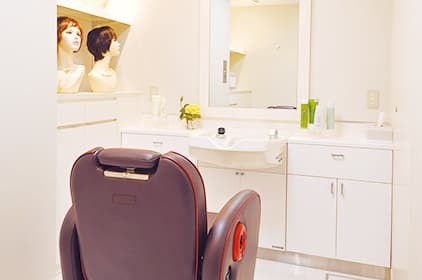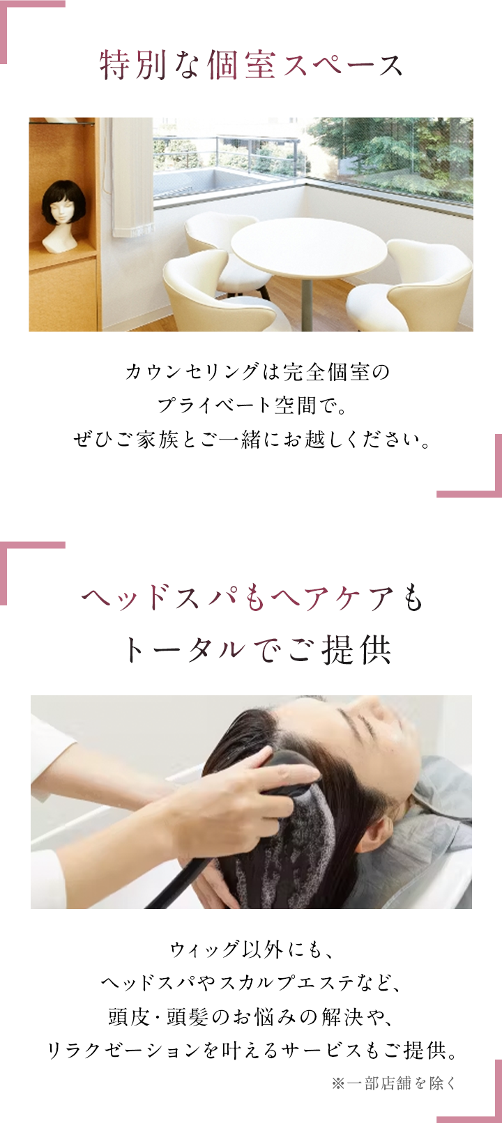 ウィッグ選びに試着はとても重要です。ゆったりとした気持ちでウィッグをご試着いただけますよう、全店舗個室をご用意しております。プライベートな空間となっておりますので、ご家族(小さなお子様の同伴も大丈夫です)やご友人とごいっしょに相談しながらウィッグをお試しください。※但し、阪大HCSのみ、個室ではなく間仕切りスペースとなります。